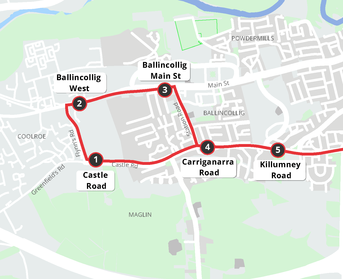 The Preferred Route then continues on Skehard Road, before turning southwards onto Mahon Link Road. A kerbside arrangement will share with buses as far as the terminus at Mahon Point.