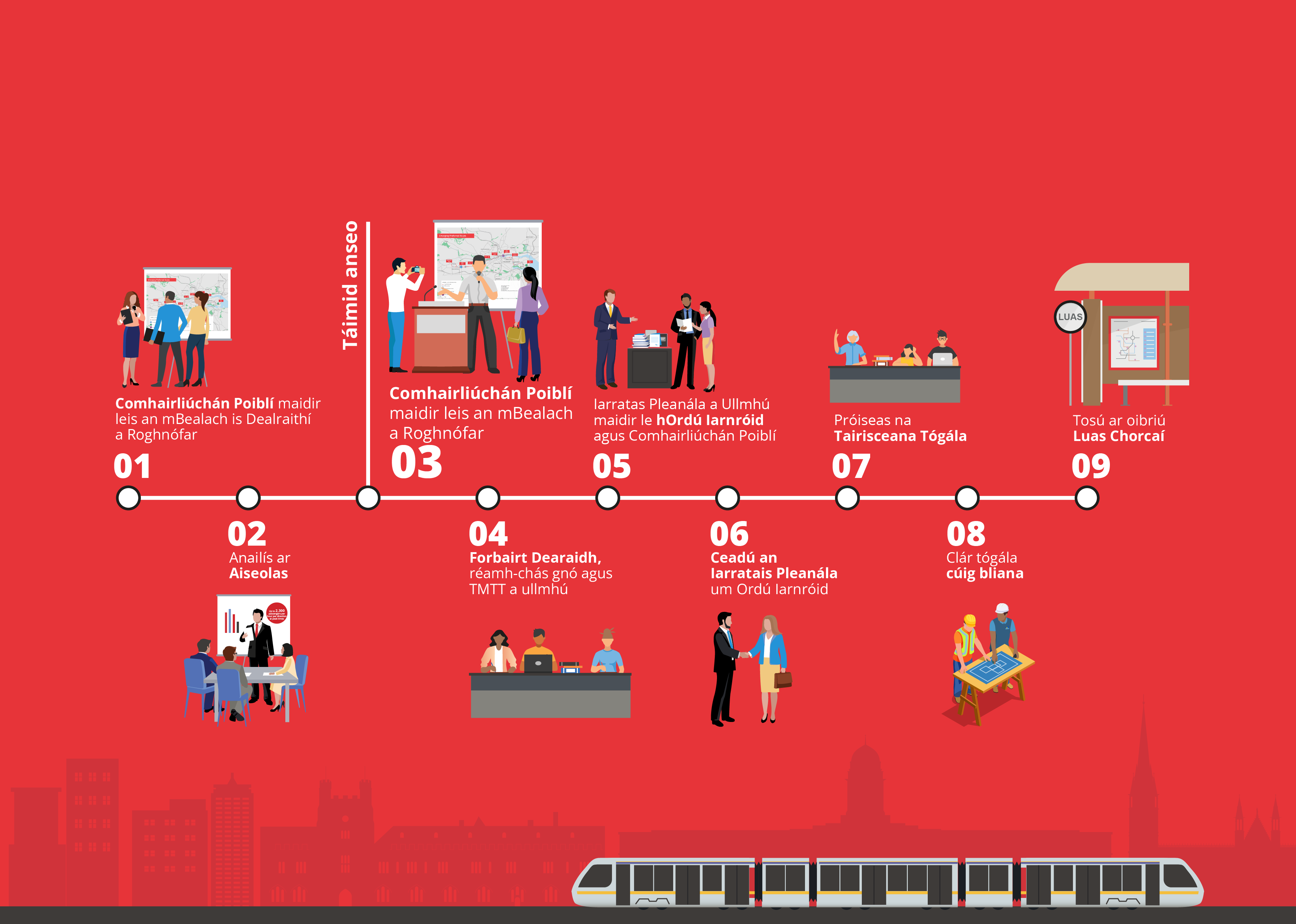 Fáilte chuig an gcomhairliúchán poiblí neamhreachtúil seo maidir leis an mBealach Roghnaithe do Luas Chorcaí. Is é atá i gceist le Luas Chorcaí ná líne iarnróid éadroim atá molta a rithfidh ó Bhaile an Chollaigh go hIonad Siopadóireachta Mahon Point, ag nascadh pobail agus cinn scríbe thábhachtacha amhail Ollscoil Teicneolaíochta na Mumhan, Ospidéal na hOllscoile, Corcaigh, Coláiste na hOllscoile, Corcaigh, lár na cathrach, Stáisiún an Cheanntaigh, Ceantar na nDugaí, Páirc Uí Chaoimh, an Dúcharraig agus Machain.