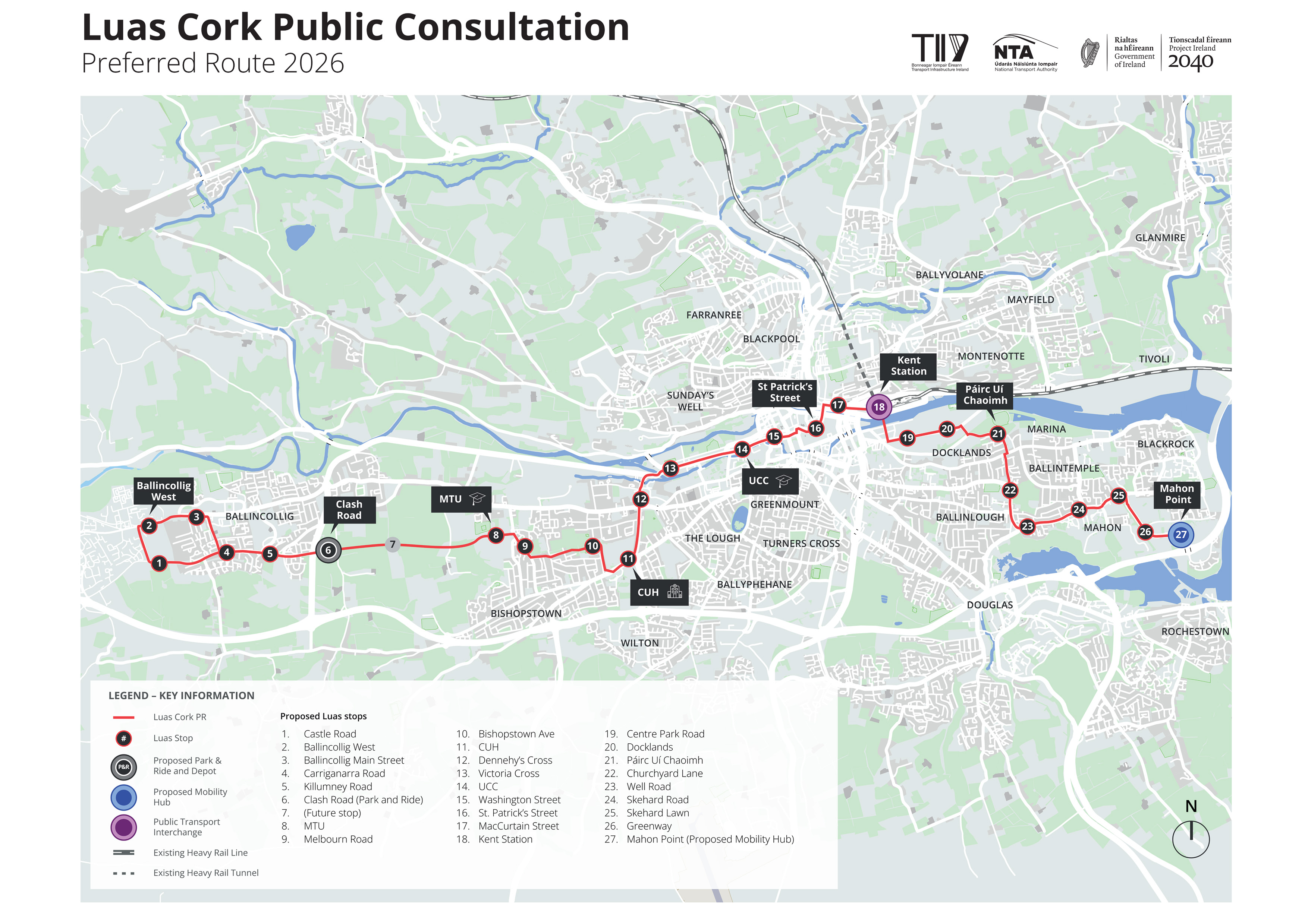 Luas Cork is a proposed light rail line running from Ballincollig to Mahon Point, connecting key destinations such as MTU, Cork University Hospital, UCC, Cork city centre, Kent Station, Cork Docklands, Blackrock and Mahon.