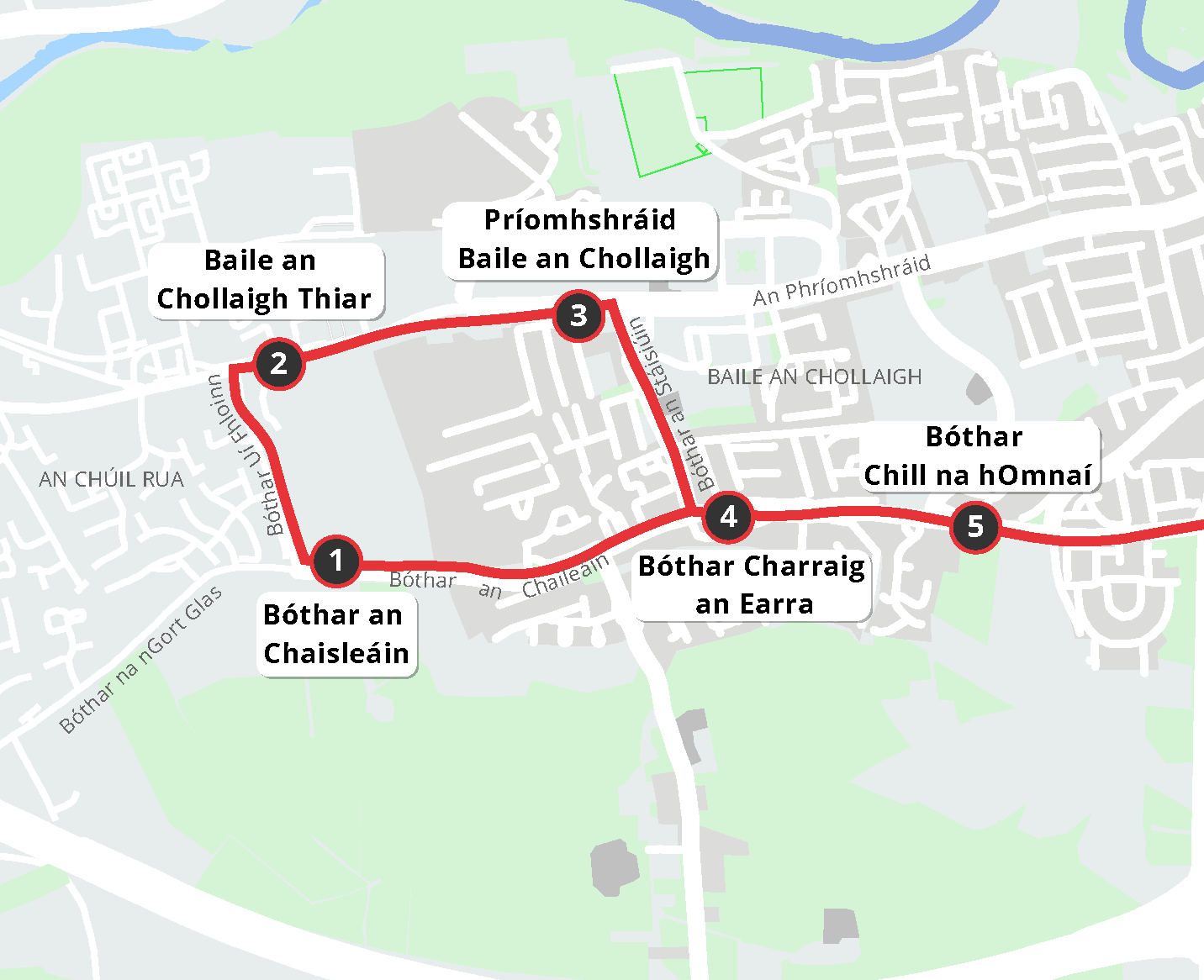 Ó Pháirc Uí Chaoimh, ritheann an líne ó dheas ar Bhóthar Bhaile Mhuire, suas an fhána chomh fada le hacomhal Bhóthar na Dúcharraige, agus roinntear an bealach le trácht rochtana áitiúla do chuid den bhealach. Leanann sé in aghaidh an aird ar Lána na Reilige agus an bealach á roinnt le trácht ó dheas a fhad le hacomhal Lána na Reilige/Bhóthar an Bhóithrín Mheánaigh, ach é scartha ó thuaidh. Déanfar páirceáil sráide atá ann cheana ar Lána na Reilige .