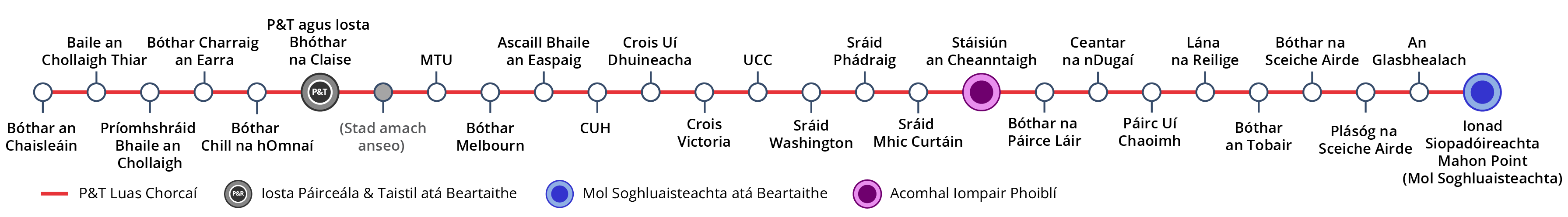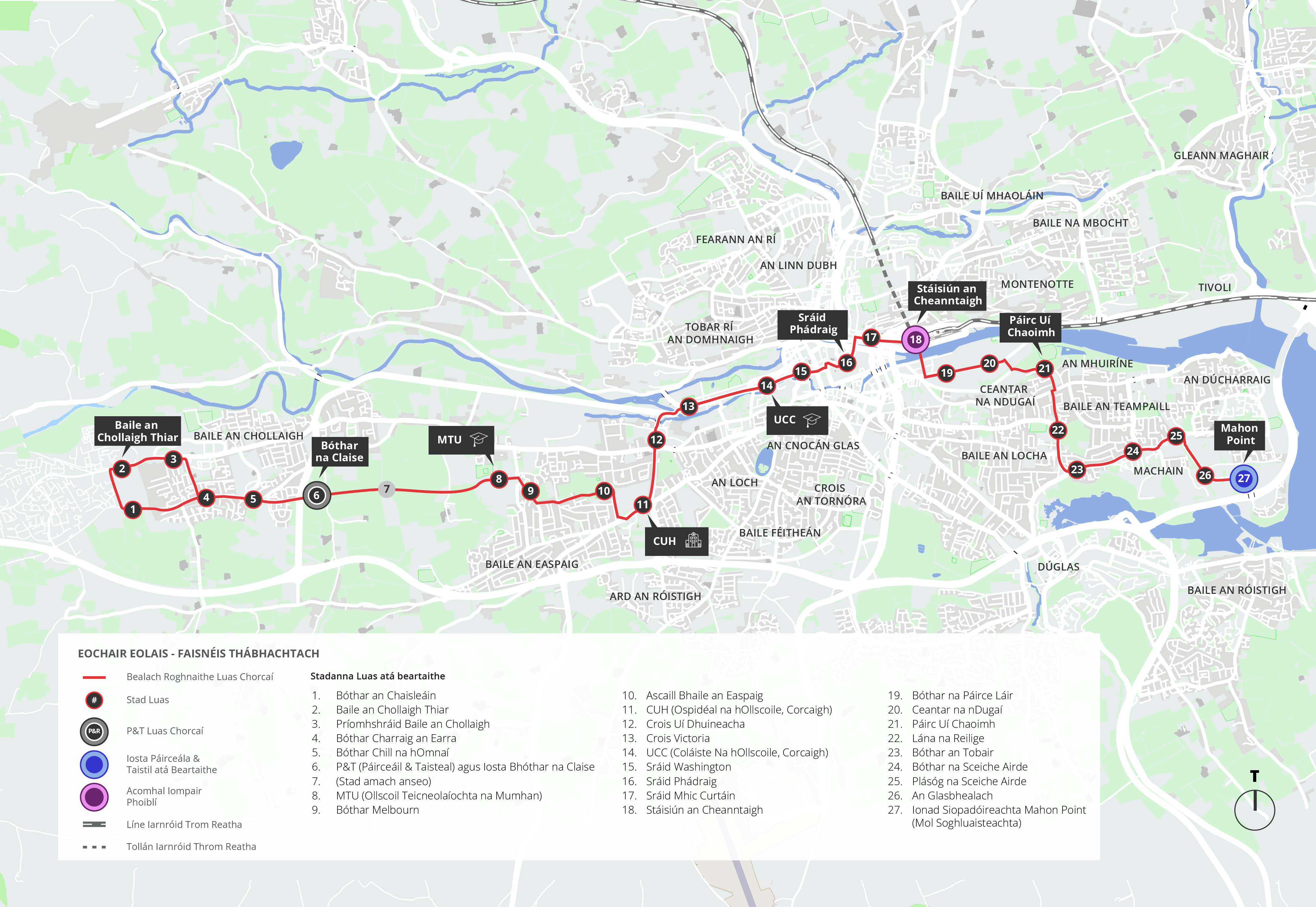 Fáilte chuig an gcomhairliúchán poiblí neamhreachtúil seo maidir leis an mBealach Roghnaithe do Luas Chorcaí. Is é atá i gceist le Luas Chorcaí ná líne iarnróid éadroim atá molta a rithfidh ó Bhaile an Chollaigh go hIonad Siopadóireachta Mahon Point, ag nascadh pobail agus cinn scríbe thábhachtacha amhail Ollscoil Teicneolaíochta na Mumhan, Ospidéal na hOllscoile, Corcaigh, Coláiste na hOllscoile, Corcaigh, lár na cathrach, Stáisiún an Cheanntaigh, Ceantar na nDugaí, Páirc Uí Chaoimh, an Dúcharraig agus Machain.