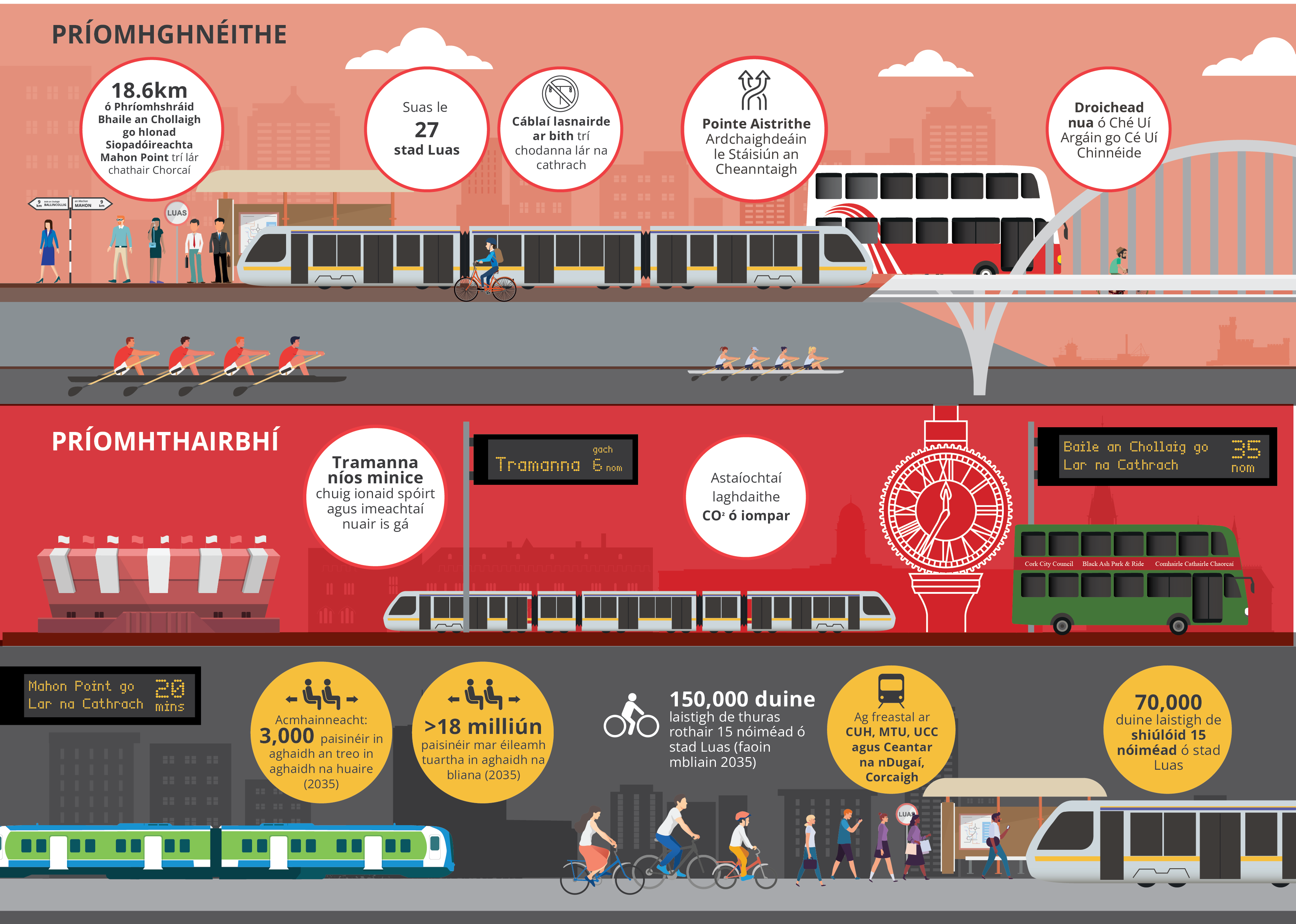 Roghnaithe do Luas Chorcaí. Is é atá i gceist le Luas Chorcaí ná líne iarnróid éadroim atá molta a rithfidh ó Bhaile an Chollaigh go hIonad Siopadóireachta Mahon Point, ag nascadh pobail agus cinn scríbe thábhachtacha amhail Ollscoil Teicneolaíochta na Mumhan, Ospidéal na hOllscoile, Corcaigh, Coláiste na hOllscoile, Corcaigh, lár na cathrach, Stáisiún an Cheanntaigh, Ceantar na nDugaí, Páirc Uí Chaoimh, an Dúcharraig agus Machain.